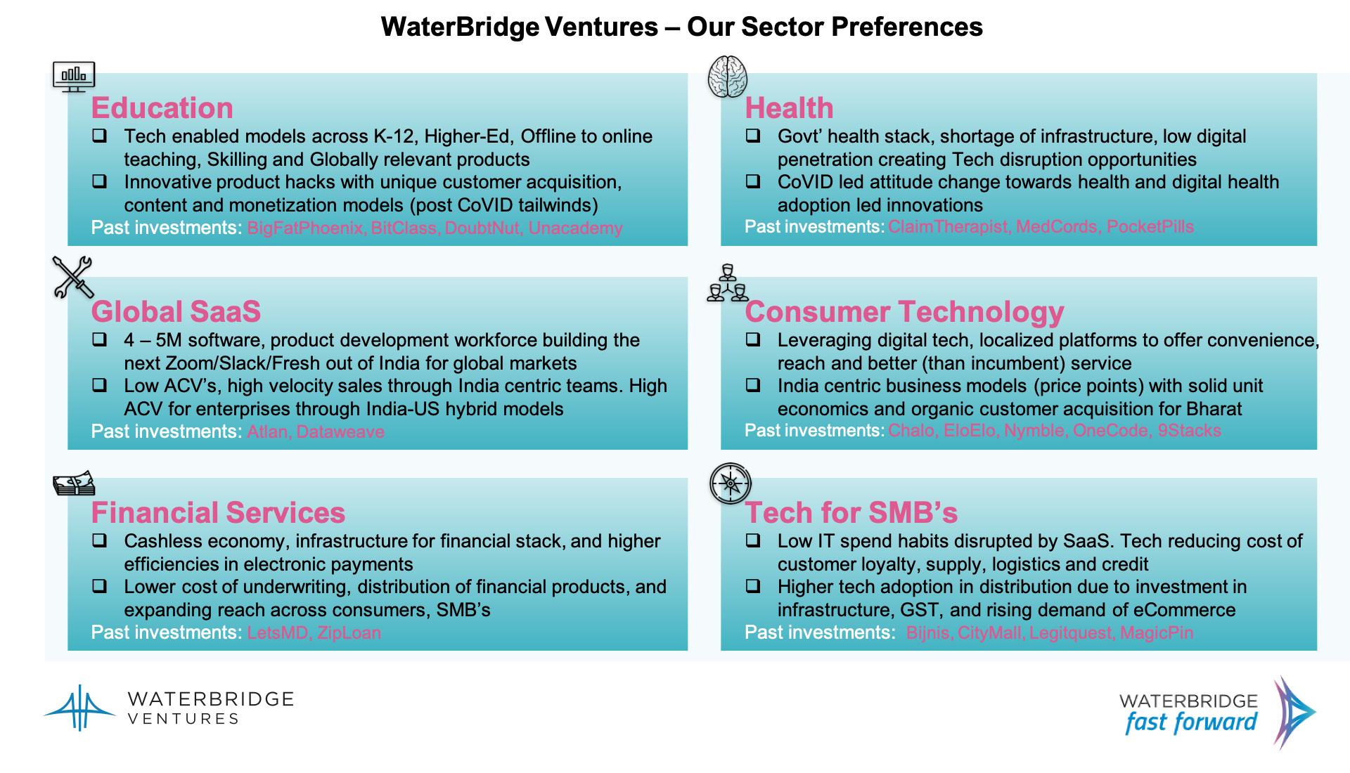 WaterBridge has a strong liking for technology disruption and we invest in a broad range of sectors like education, health, financial services, logistics & distribution, gaming, internet commerce, social commerce, mobility and consumer tech with network effects. We invest in B2C as well as B2B (SME or Enterprise customers, India or global market focus) startups. If technology led disruption is at the core of your business model, it is more exciting for us.